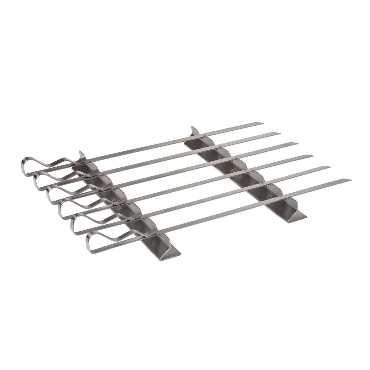 Deze set van 6 brede spiesen met een 2-delige geborsteld roestvrijstalen houder is ideaal voor het bereiden van bv. shaslick, groenten en kebab. De scherpe punten maken het mogelijk om het barbecuegoed eenvoudig op te spiesen, de brede vorm voorkomt het verdraaien van het barbecuegoed op de spiesen. De spiesen kunnen in verschillende standen op de houder worden gelegd om gelijkmatig barbecueën mogelijk te maken