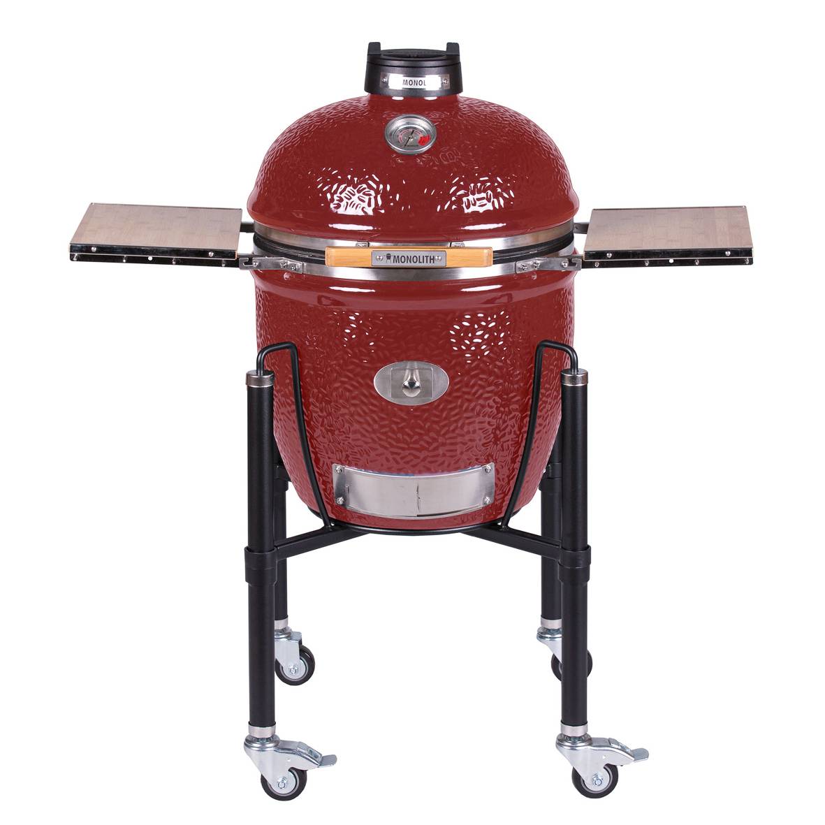 De MONOLITH Classic is verkrijgbaar in de kleuren zwart en rood. Leverbaar als uitvoering met stalen onderstel en zijtafels van bamboe, alsmede zonder onderstel en zijtafels maar met keramische voetjes voor plaatsing in de door jezelf ontworpen buitenkeuken of in onze buggy of teakhouten tafel.