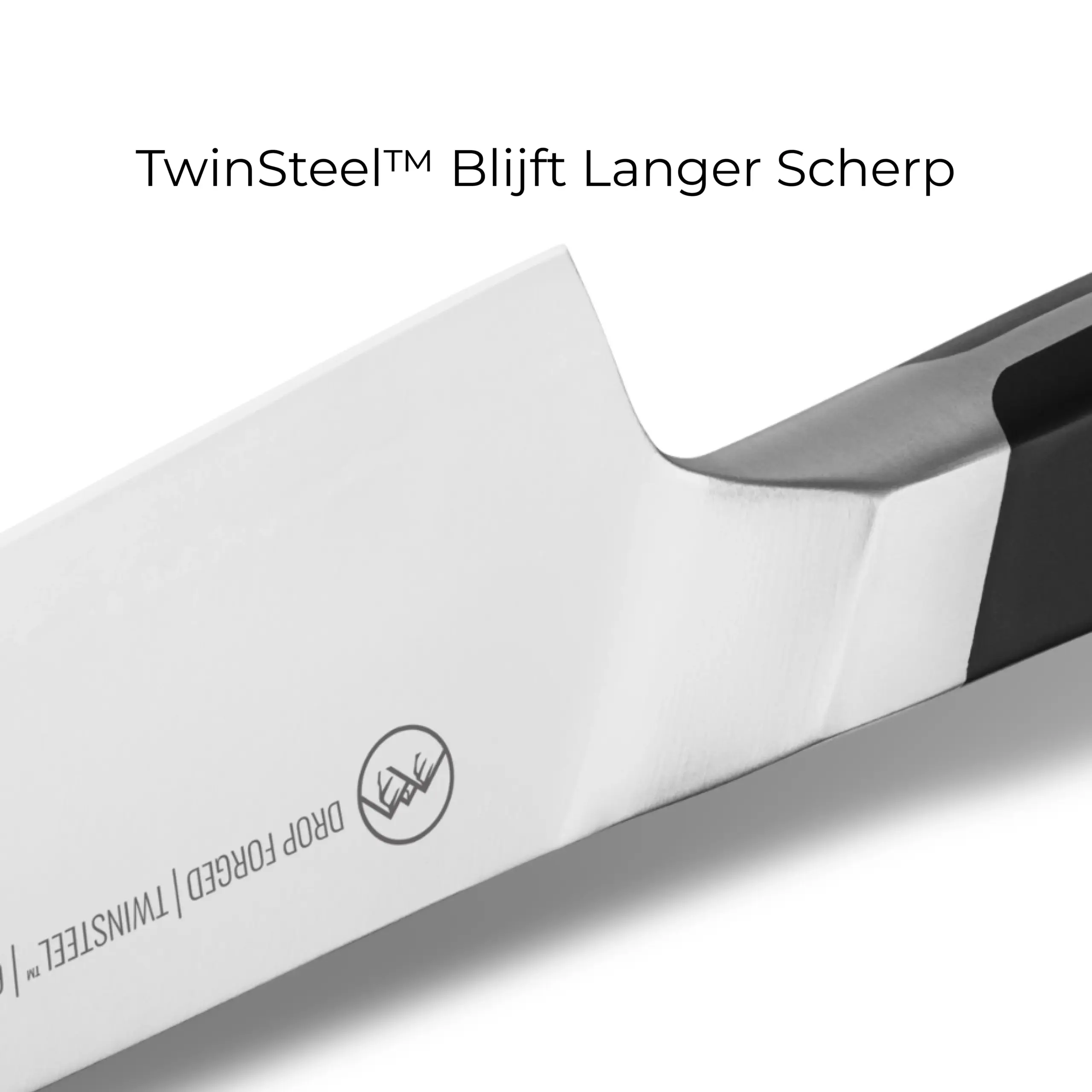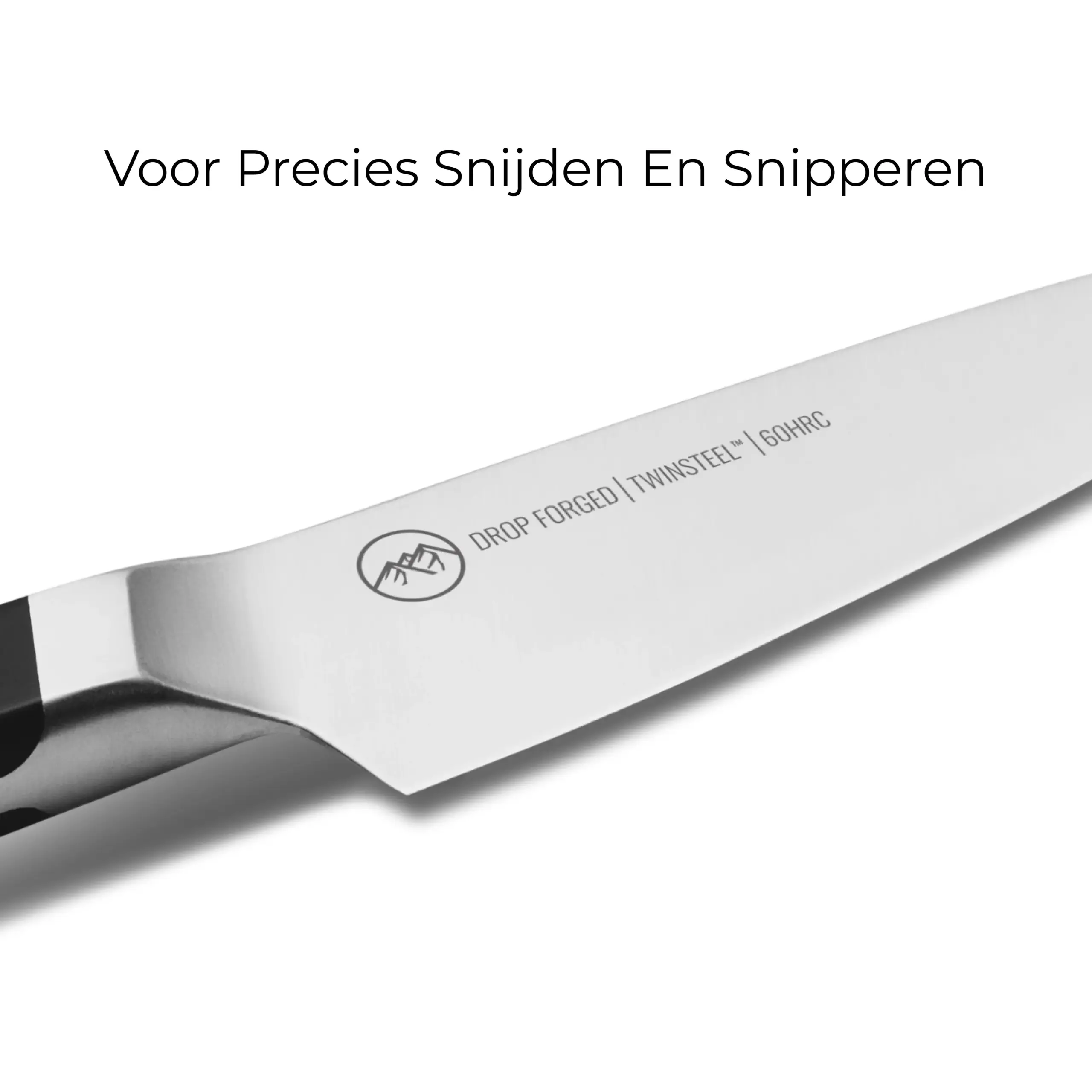 Ons Santoku-mes heeft een kort lemmet en een recht snijprofiel, waardoor taken zoals het snijden van fijne vis en groenten moeiteloos verlopen.